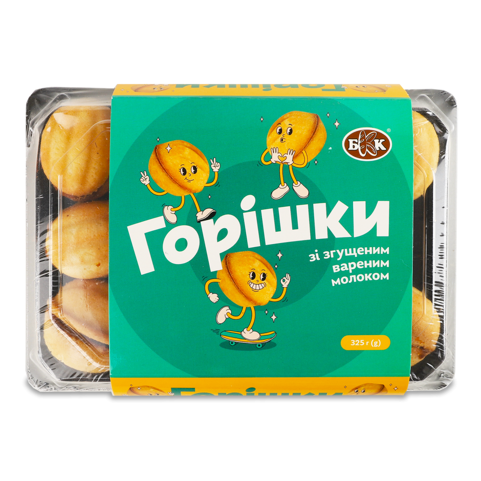 ПЕЧИВО «ГОРІШКИ ЗІ ЗГУЩЕНИМ МОЛОКОМ» ТМ «БКК» - печиво складається з двох половинок пісочного печива, у вигляді горішків. Половинки наповнені й з'єднані між собою молочною начинкою "Іриска".